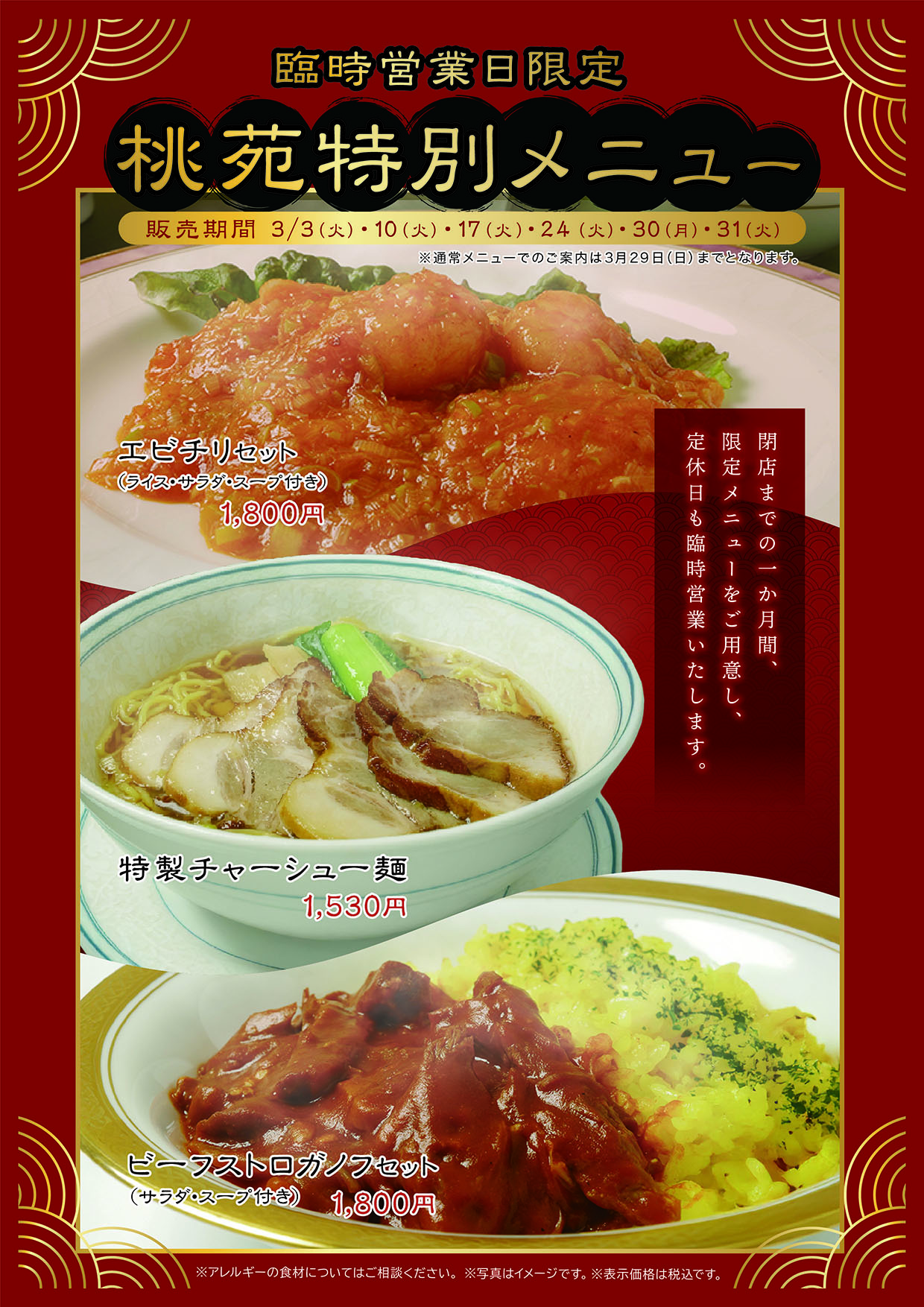 中国料理桃苑 3月臨時営業日のご案内