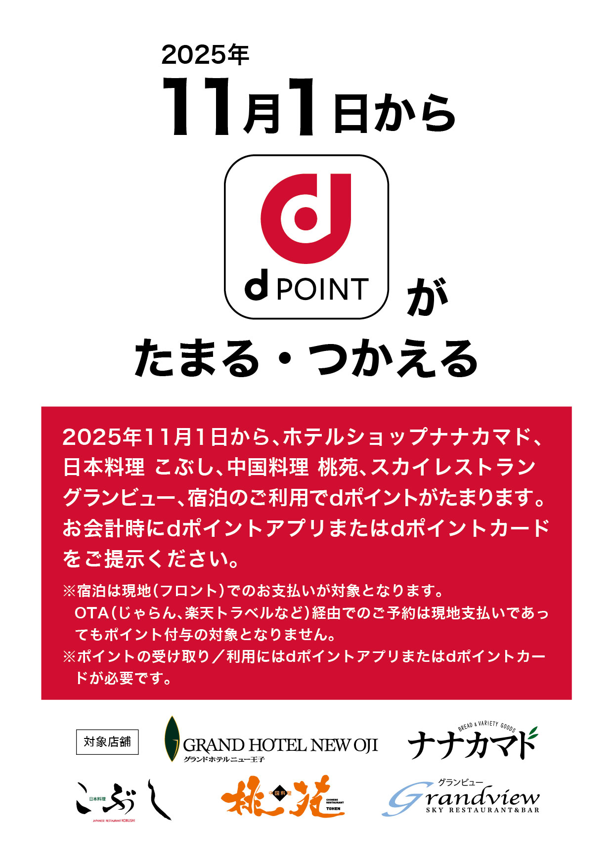 これまでご愛顧いただきましたホテルニュー王子メンバーシップクラブカードに代わるサービスとして、ホテルショップナナカマド、日本料理 こぶし、中国料理 桃苑、スカイレストラン グランビュー、宿泊※のご利用に対しdポイントを付与いたします。ご利用額100円につき1ポイントがたまり、1ポイント1円としてお支払にもお使いいただけます。