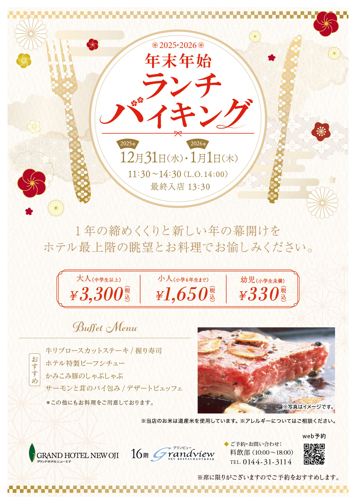 11:30~14:30 バイキングの最終入店13:30 ラストオーダー14:00