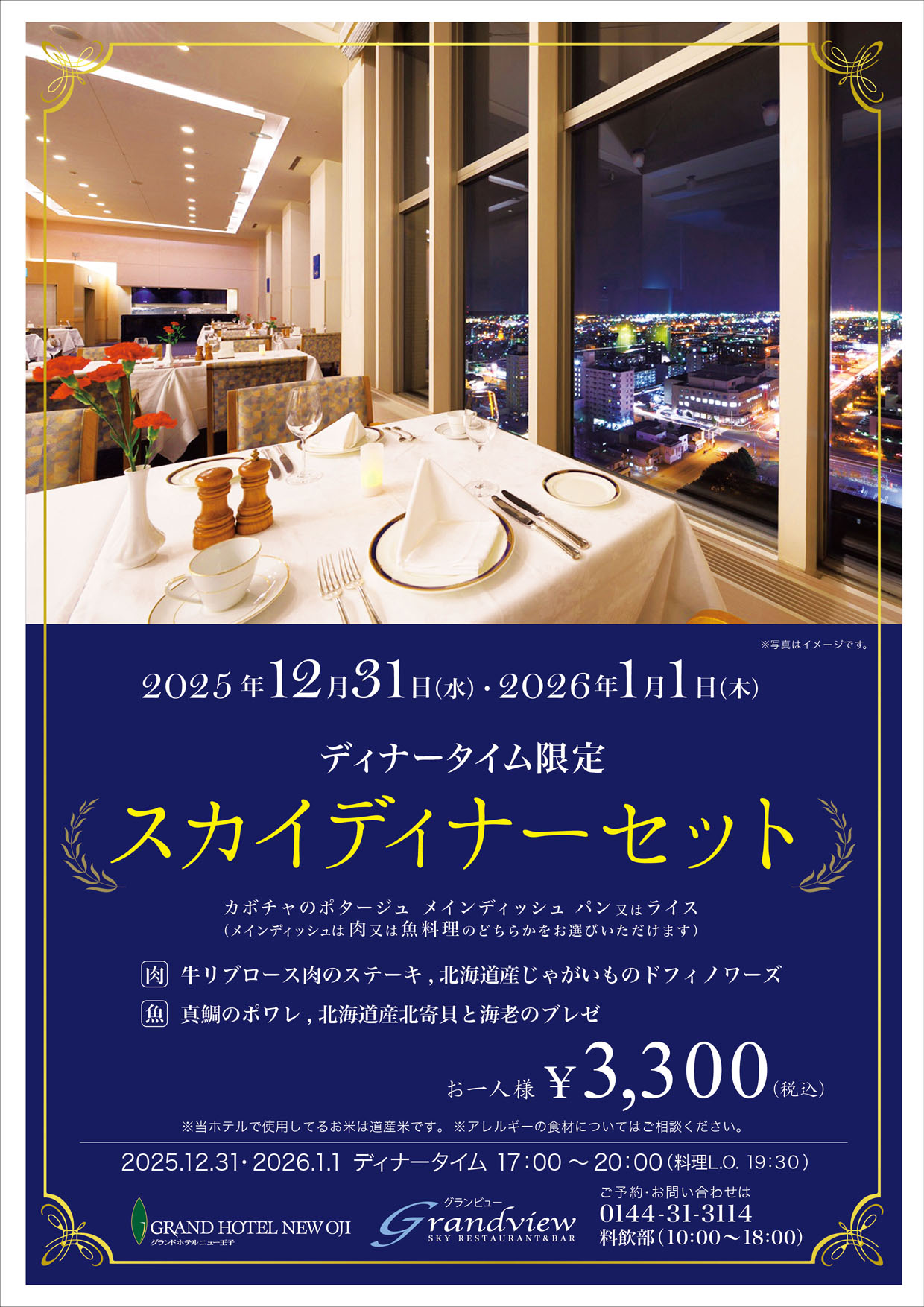 スカイレストラングランビューでは、2025年12月31日(水)と2026年1月1日(木)のニ日間、「スカイディナーセット」を販売いたします。