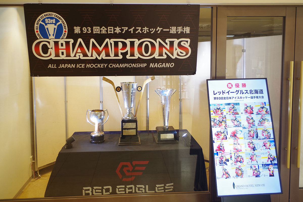 このたび、2025年12月に開催された「第93回全日本アイスホッケー選手権」にて7年ぶりの優勝を果たしたレッドイーグルス北海道様のご厚意により、優勝トロフィーを下記のとおり展示しております。